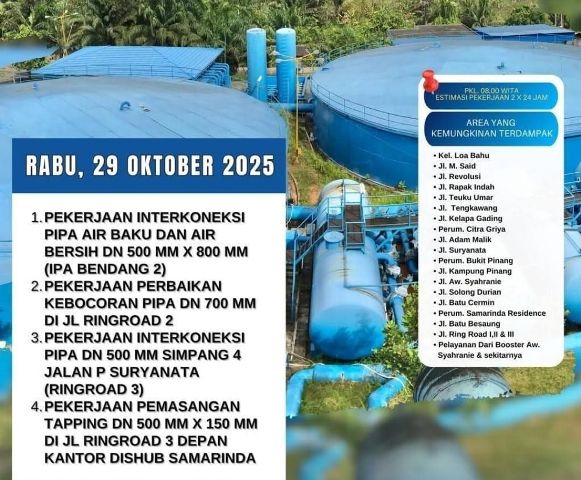 “Rencananya pekerjaaan dilaksanakan pada Rabu 29 Oktober 2025 mulai pukul 08.00 Wita,” kata juru bicara Humas Perumdam Tirta Kencana, Taufik di Samarinda, Senin (27/10).